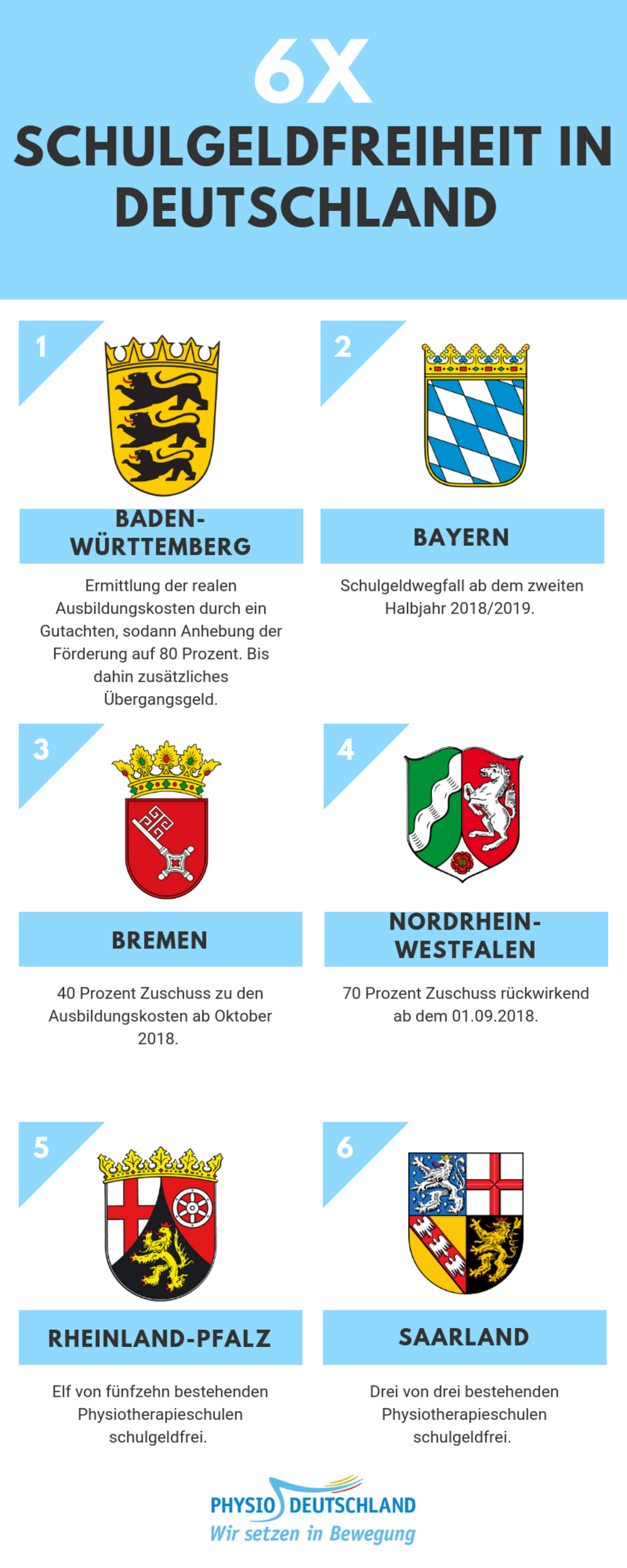 In sechs Bundesländern zeigen sich nun erste Erfolge. Dort wurde das Schulgeld entweder ersatzlos gestrichen, oder es existieren Zuschüsse im Rahmen von Förderprogrammen. Doch noch ist viel zu tun! Weitere Bundesländer müssen dem Beispiel folgen und angehende Physiotherapeuten konsequent unterstützen. PHYSIO-DEUTSCHLAND setzt sich deshalb auch zukünftig für eine kostenfreie Ausbildung in ganz Deutschland ein.