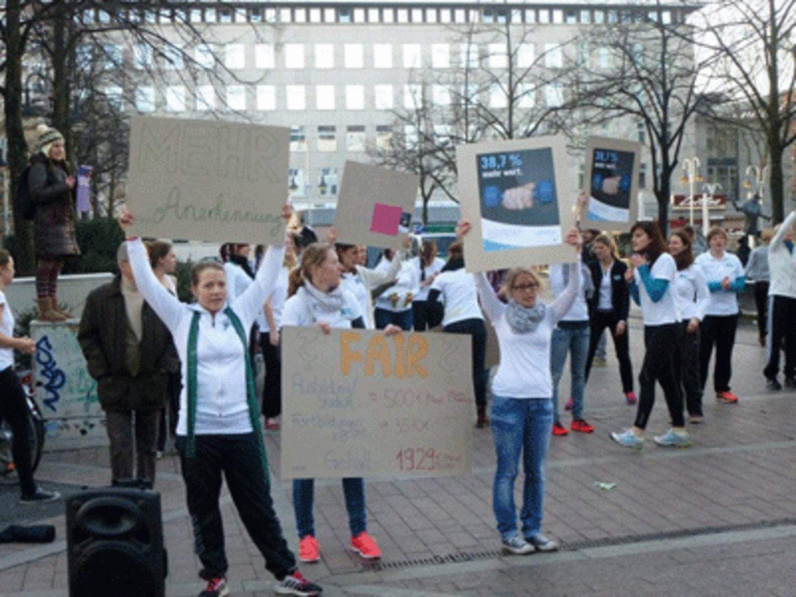 Ob in Hamburg, Berlin, München oder Bochum – der lautstarke Protest der jungen Physios gegen die ungerechte Bezahlung in ihrem Beruf war nicht zu überhören. Ausgerüstet mit Transparenten, Megaphon und Kampagnenflyern machten sie Passanten auf die aktuelle Kampagne "38,7 % mehr wert." aufmerksam und klärten über die drohende Unterversorgung in der Physiotherapie auf. Auch in Frankfurt, München und Reutlingen protestierten die Nachwuchskräfte gegen die rückläufige Lohnentwicklung in der Physiotherapie.