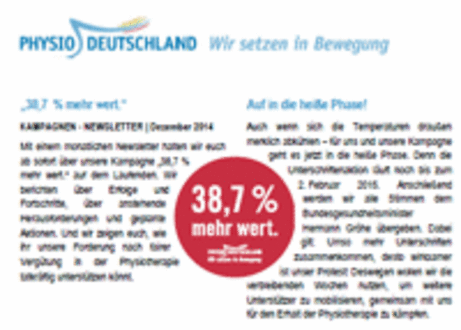 In der aktuellen wie auch in den folgenden Ausgaben des Newsletters berichten wir über Erfolge und Fortschritte, über anstehende Herausforderungen und geplante Aktionen der Kampagne. Und wir zeigen, wie jede und jeder Einzelne unsere Forderung nach fairer Vergütung in der Physiotherapie tatkräftig unterstützen kann. Denn persönliches Engagement bringt unsere Kampagne weiter voran. Deshalb wollen wir uns an dieser Stelle ganz herzlich bei allen unseren Unterstützern bedanken! Die starke Resonanz innerhalb unserer Berufsgruppe, aber auch von Patientinnen und Patienten bestärkt uns darin, weiter für die Forderung nach einer angemessenen Vergütung zu kämpfen. Wir wollen der Politik aufzeigen, dass es so nicht mehr weitergehen kann. Du möchtest keine Infos mehr verpassen? Dann abonniere unseren Newsletter über das Portal www.physiotherapie-ist-mehr-wert.de, indem du deine E-Mail-Adresse in der Box "Immer auf dem Laufenden" eingibst. Dann erhältst du eine Nachricht, sobald die nächste Ausgabe des Newsletters online abrufbar ist.