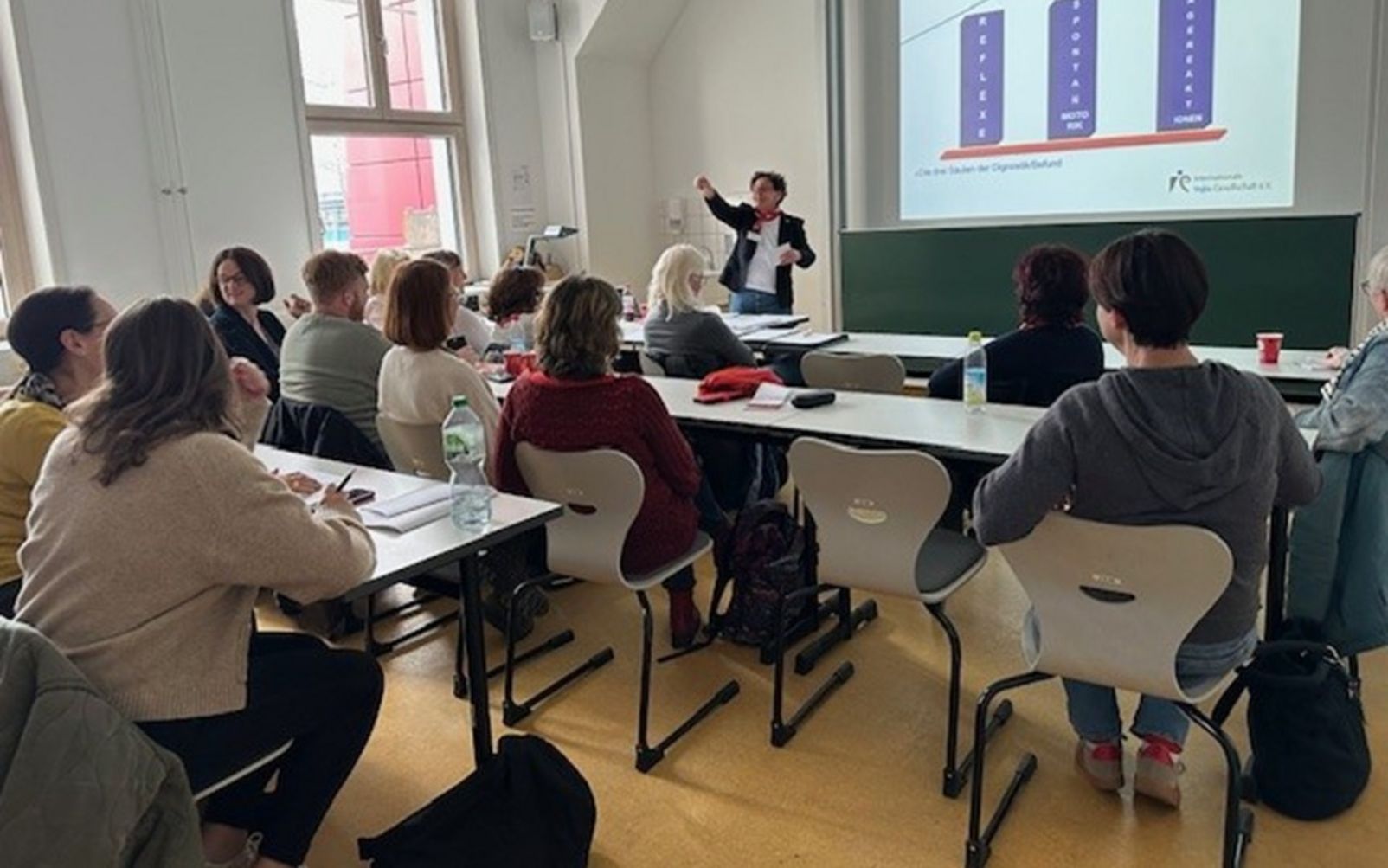 Nach dem erkenntnisreichen Vormittag folgte am Nachmittag ein intensives und vielfältiges Workshop-Programm, das die Inhalte des Vormittags praxisorientiert vertiefte. Zur Auswahl standen mehrere Workshops: „Assessments – auch in der Praxis zu schaffen“ mit Katharina von Bistram (BcPT, Hamburg), „Wenn die Blase nicht mitspielt: Familienorientierte Wege zu mehr Selbstwirksamkeit“ mit Sevinc Türker (PT, Nürnberg), „Sexualisierte Gewalt erkennen und umsichtig handeln“ mit Birthe Roden (Traumapädagogin, Kinderschutzfachkraft, Hamburg), „Implementierung der Reflexlokomotion im Wandel der Familienkonzepte“ mit Iris von der Lippe (PT, Bochum) und „Teilhabeorientierte Physiotherapie mit ICF – Wie gelingt es in der Praxis und welcher Mehrwert könnte entstehen?“ mit Dr. Heike Phillippi (Frankfurt). Alle Workshops boten konkrete Handlungsempfehlungen und viel Raum für Austausch, Diskussionen und fallbezogenes Arbeiten. Die Teilnehmenden lobten besonders den unmittelbaren Praxisbezug und die Möglichkeiten, neue Perspektiven und Tools direkt für den eigenen Berufsalltag mitzunehmen. Abgerundet wurde das Symposium durch einen Abschlussimpuls von Frauke Mecher von Physio Deutschland unter dem Motto „Still Face – Erster Kontakt mit Handy, Tablet & Co.“. Damit thematisierte die Leiterin der Arbeitsgemeinschaft Vojta von Physio Deutschland anschaulich, wie digitale Ablenkung bereits in den ersten Lebensmonaten die Feinabstimmung zwischen Eltern und Kind beeinflussen kann. Ihr Appell: „Für die gesunde Entwicklung brauchen Kinder zunächst echte Begegnung – Blickkontakt, Stimme, Nähe. Therapeut*innen können Familien gezielt dafür sensibilisieren, wie wichtig diese frühen Interaktionen sind.“